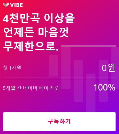 네이버에서 운영하고 있는 음악 플랫폼으로 바이브라는 스트리밍 서비스가 있습니다. 유튜브 뮤직이나 애플 뮤직처럼 좋아하는 아티스트를 기반으로 플레이리스트를 추천해주는 방식인데요.