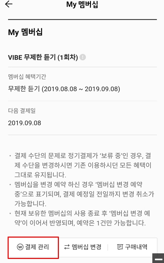요즘 대부분의 컨텐츠 서비스들이 그렇듯이 바이브 역시 월정기결제 시스템을 적용하고 있습니다. 프로모션을 위해 구독 첫달에는 무료로 이용이 가능하고 다음달부터는 매월 정액제로 요금을 결제해야 합니다.